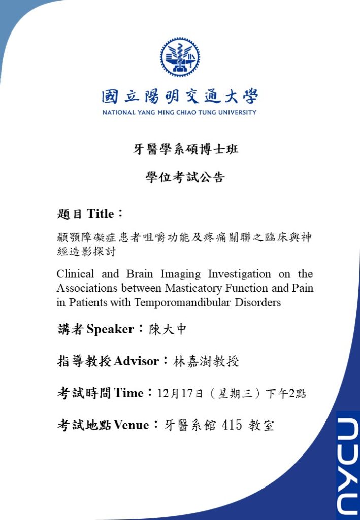 【學位考公告】牙醫學系碩士班陳宇江同學學位考試(1/9 PM1:30)